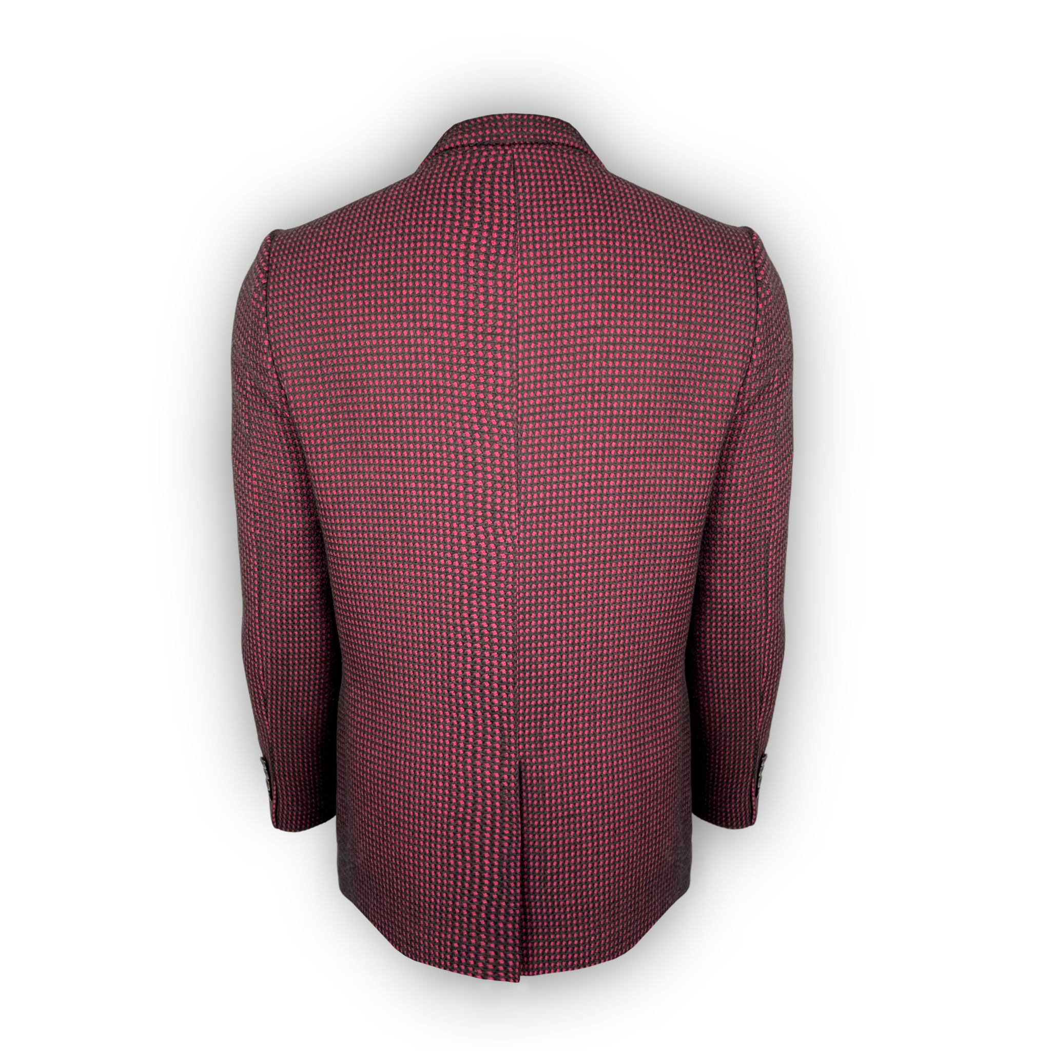 El blazer Burdeos Eléctrico es una oda a la textura y al detalle en el diseño. Confeccionado en una mezcla estructurada de poliéster y viscosa de alta calidad, su tejido presenta un patrón microgeométrico en burdeos y fucsia que aporta profundidad visual y una presencia vibrante sin sacrificar elegancia.