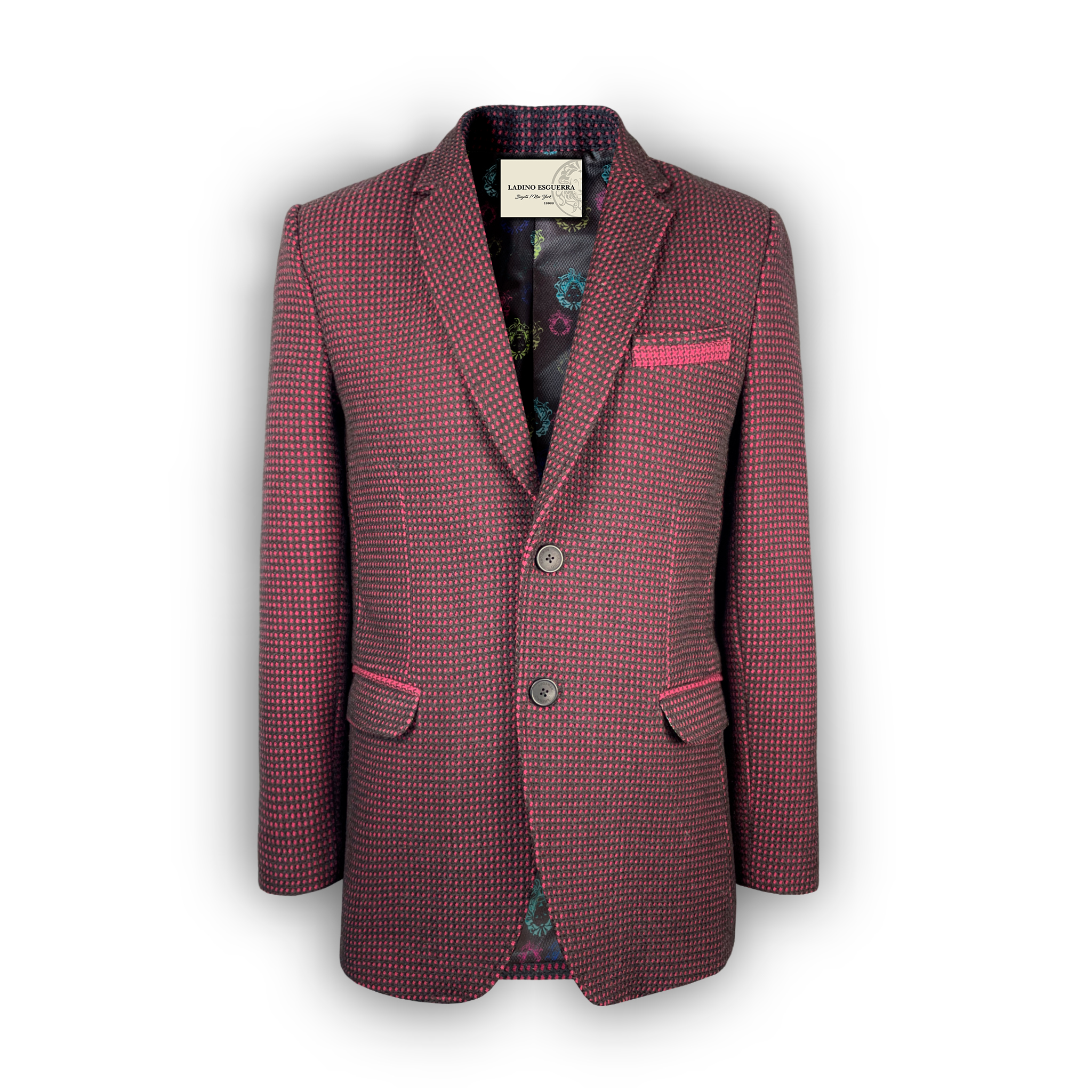 El diseño cuenta con una solapa clásica tipo notch, cierre de dos botones al frente, y bolsillos con solapa perfectamente integrados al corte. El bolsillo superior tipo ojal destaca con una viva fucsia que contrasta sutilmente, aportando un toque sofisticado y moderno.