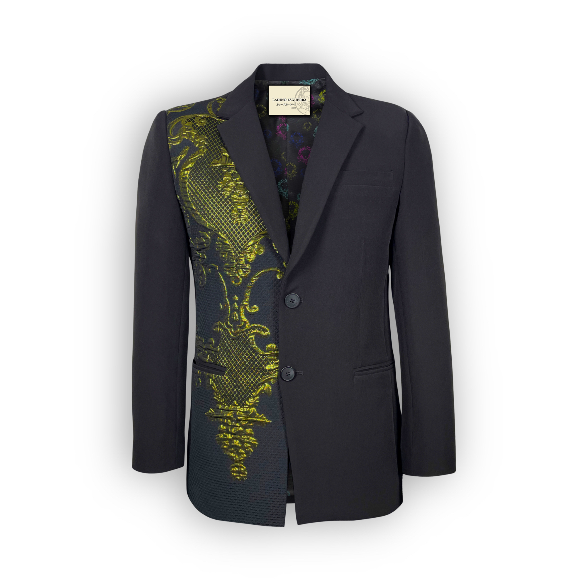 El conjunto Baroque Rebel rompe las reglas de la sastrería clásica. Con un blazer negro estructurado que explota en un estampado barroco dorado de inspiración imperial en un solo lado, esta pieza grita actitud, lujo y provocación. Acompañado por un pantalón liso que equilibra el conjunto, es ideal para el hombre que no teme ser el centro de todas las miradas, ya sea en un evento, pasarela o noche icónica.