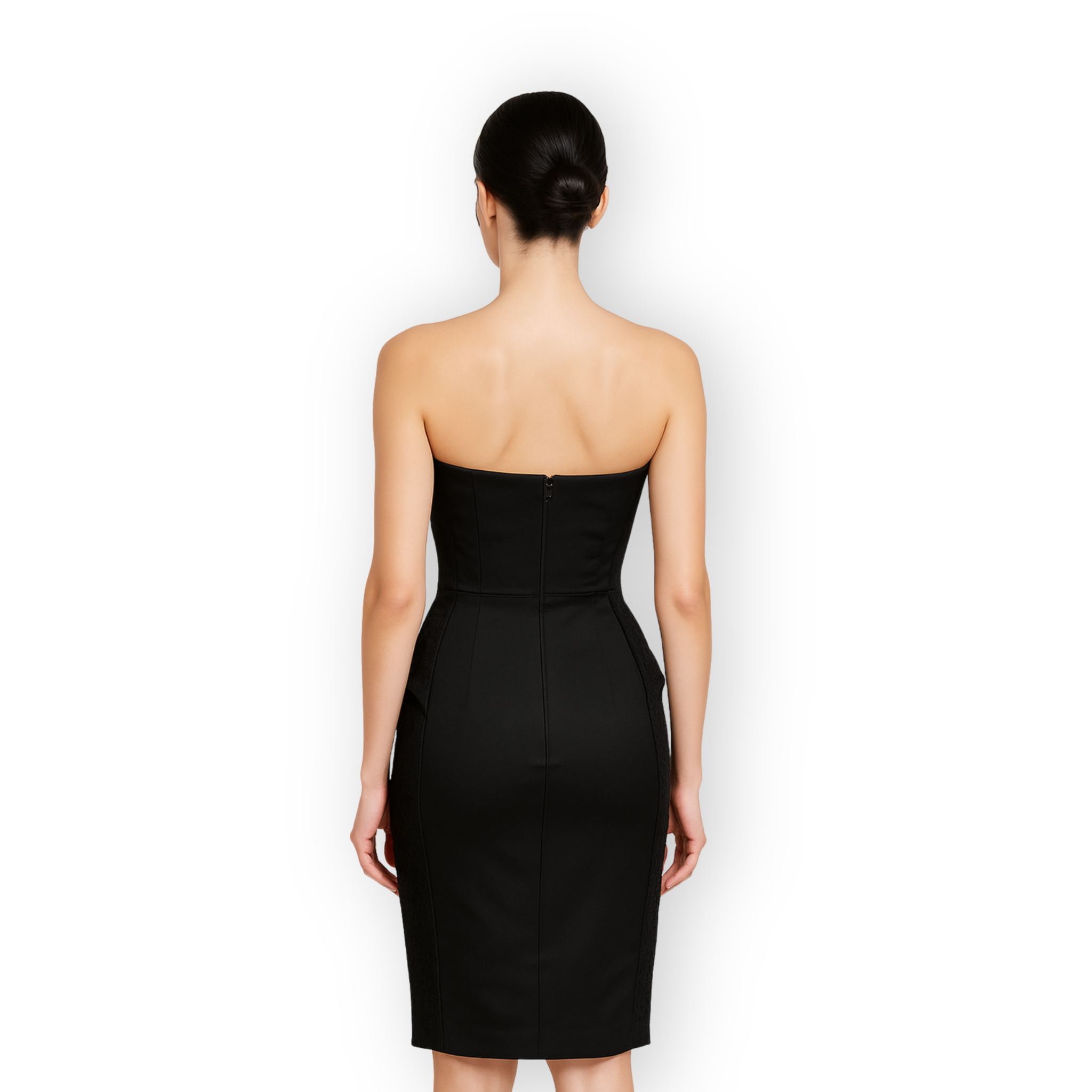 El vestido Midnight Silhouette redefine la elegancia con una silueta ceñida al cuerpo y un diseño estructurado que exuda sofisticación. Confeccionado en un textil negro de alta densidad y paneles laterales en encaje tono sobre tono, aporta una textura sutil y femenina que contrasta delicadamente con la base lisa.