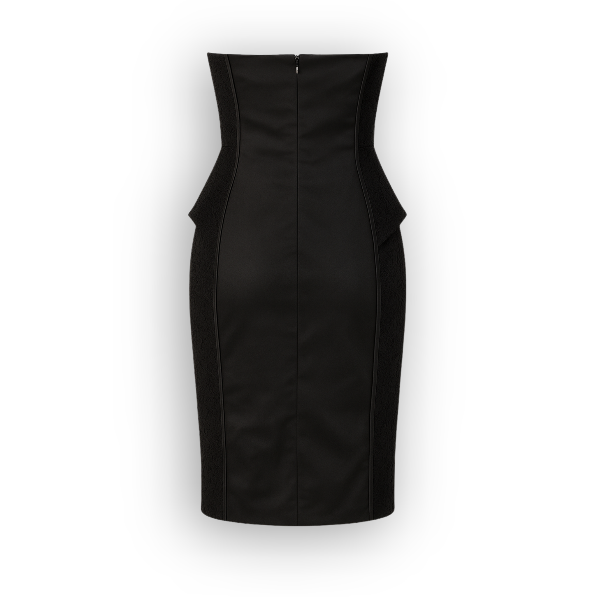 Su escote corazón strapless enmarca el busto con delicadeza, mientras que el detalle tipo peplum estructurado en la cintura acentúa la figura reloj de arena, creando un efecto esculpido visualmente impactante. La falda tipo lápiz de largo midi alarga la silueta, haciéndolo ideal para ocasiones formales o eventos de noche en los que se busca impactar con distinción.