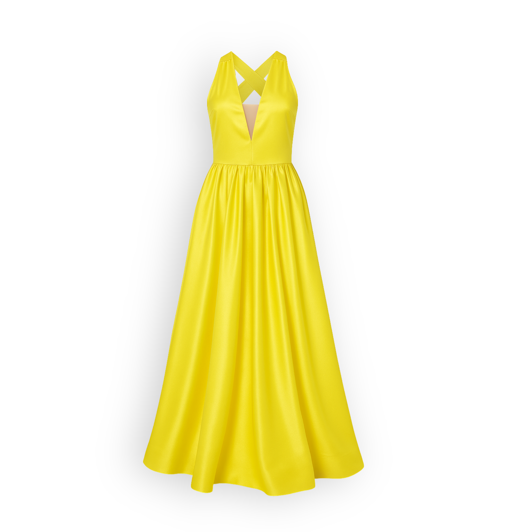 Radiante y sofisticado, el vestido Solar Bloom es una oda al poder de la luz y la feminidad. Confeccionado en un satén de alta costura con acabado mate y suave brillo natural, esta pieza en amarillo vibrante ilumina cualquier ocasión con su sola presencia.